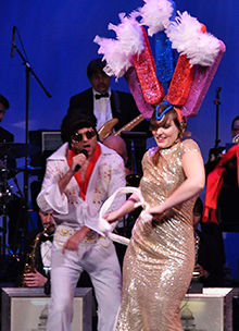 Jared sings as Elvis while Sonya dances (and yes, that is a one-of-a-kind toothbrush headdress!) in the 2016 Union Gospel Mission Dental Fundraiser Show.
