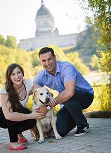 Sonya and Shane getting their engagement photos taken in front of the capitol building with Sven.